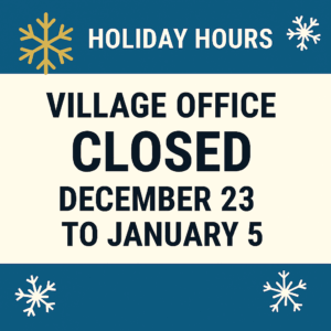Holiday Closure Holiday Hours Notice The Village Office will be closed from December 23 to January 5 for the holiday season. We’ll reopen on Monday, January 5 at our regular hours. Wishing everyone a safe, joyful, and relaxing holiday! cao@hillspring.ca2025-12-09T21:32:04-07:00December 9, 2025| Share This Story, Choose Your Platform! FacebookXRedditLinkedInWhatsAppTumblrPinterestVkXingEmail